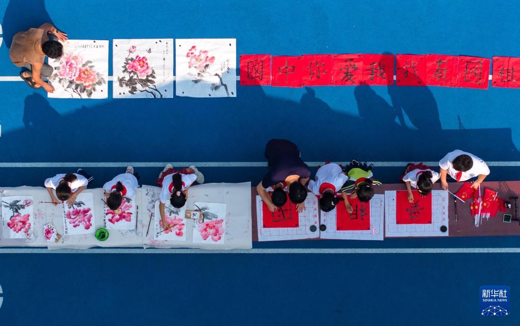 9月27日,在四川省眉山市彭山區(qū)鵬利小學(xué),學(xué)生通過書法和繪畫表達(dá)對祖國的祝福(無人機(jī)照片)。