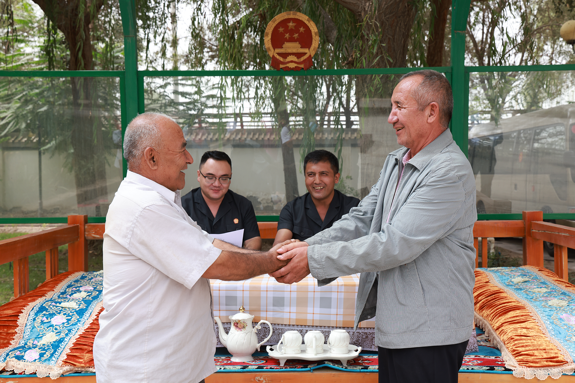 拉斯奎人民法庭收到案件后,庭長阿布都熱扎克·卡德爾將原告和被告一起叫到垂柳樹下喝茶聊天,聽他們各自訴說生活中的家長里短、困難不易。隨后,在阿布都熱扎克庭長的耐心調解下,雙方簽訂了調解協議,被告向原告支付剩余欠款中的50000元即可,但是必須于2024年10月12日前付清。帕某與沙某的友誼之舟再次向遠方航行。