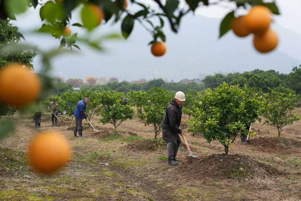 永寧江畔的橘園里,來(lái)自黃巖區(qū)頭陀鎮(zhèn)孫家匯村的村民周春國(guó)正與10多名村民一起,拿著鐵鍬等工具為橘樹(shù)施肥。