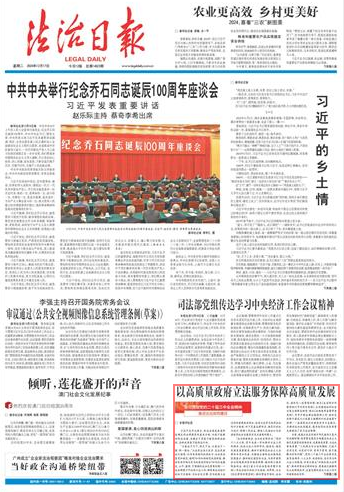 當(dāng)前,我國(guó)正處在實(shí)現(xiàn)中華民族偉大復(fù)興的關(guān)鍵時(shí)期,高質(zhì)量發(fā)展是全面建設(shè)社會(huì)主義現(xiàn)代化國(guó)家的首要任務(wù)。發(fā)展要高質(zhì)量,立法也要高質(zhì)量,“人民群眾對(duì)立法的期盼,已經(jīng)不是有沒(méi)有,而是好不好、管用不管用、能不能解決實(shí)際問(wèn)題”。黨的二十屆三中全會(huì)要求完善黨委領(lǐng)導(dǎo)、人大主導(dǎo)、政府依托、各方參與的立法工作格局,并首次提出“加強(qiáng)政府立法審查”。新的形勢(shì)決定新的任務(wù),需要我們持續(xù)深化立法領(lǐng)域改革,注重發(fā)揮政府在立法工作中的重要依托作用,加強(qiáng)和改進(jìn)政府立法制度建設(shè),不斷提高政府立法質(zhì)效,以高質(zhì)量政府立法服務(wù)保障高質(zhì)量發(fā)展。