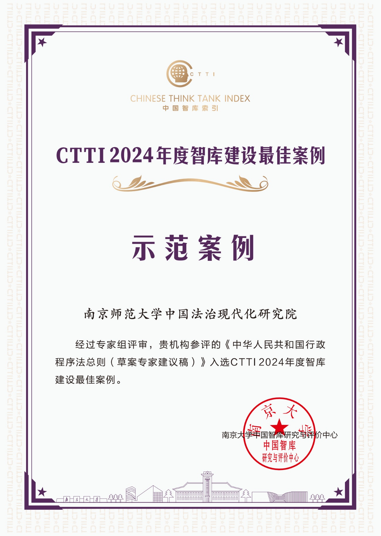 2024年12月7日,南京大學(xué)中國(guó)智庫(kù)研究與評(píng)價(jià)中心公布,南京師范大學(xué)中國(guó)法治現(xiàn)代化研究院的《中華人民共和國(guó)行政程序法總則(草案專家建議稿)》入選CTTI2024年度智庫(kù)建設(shè)最佳案例示范案例。