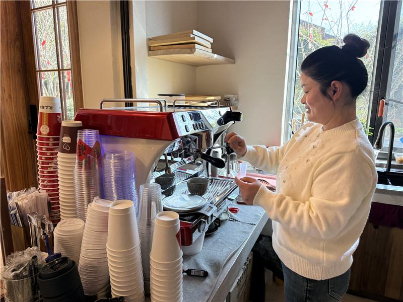 吳巧云正在咖啡屋給游客制作咖啡。人民網(wǎng)記者 張雋攝