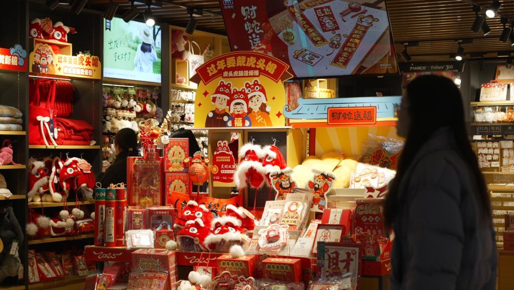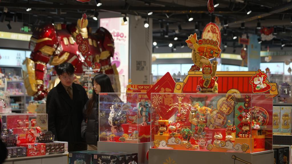 “閑來逛市場,年貨盡琳瑯?!背允呈悄晡?,裝飾是彩頭,年貨市場紅紅火火。在江西南昌一商超內(nèi),購置年貨的消費(fèi)者人頭攢動(dòng)。不遠(yuǎn)處一家潮玩店也是門庭若市,店內(nèi)潮流人偶戴上“財(cái)神帽”,顆粒拼裝的積木花蕊在枝頭綻放,舞獅、錦鯉、招財(cái)貓等節(jié)日“使者”穩(wěn)居C位……
