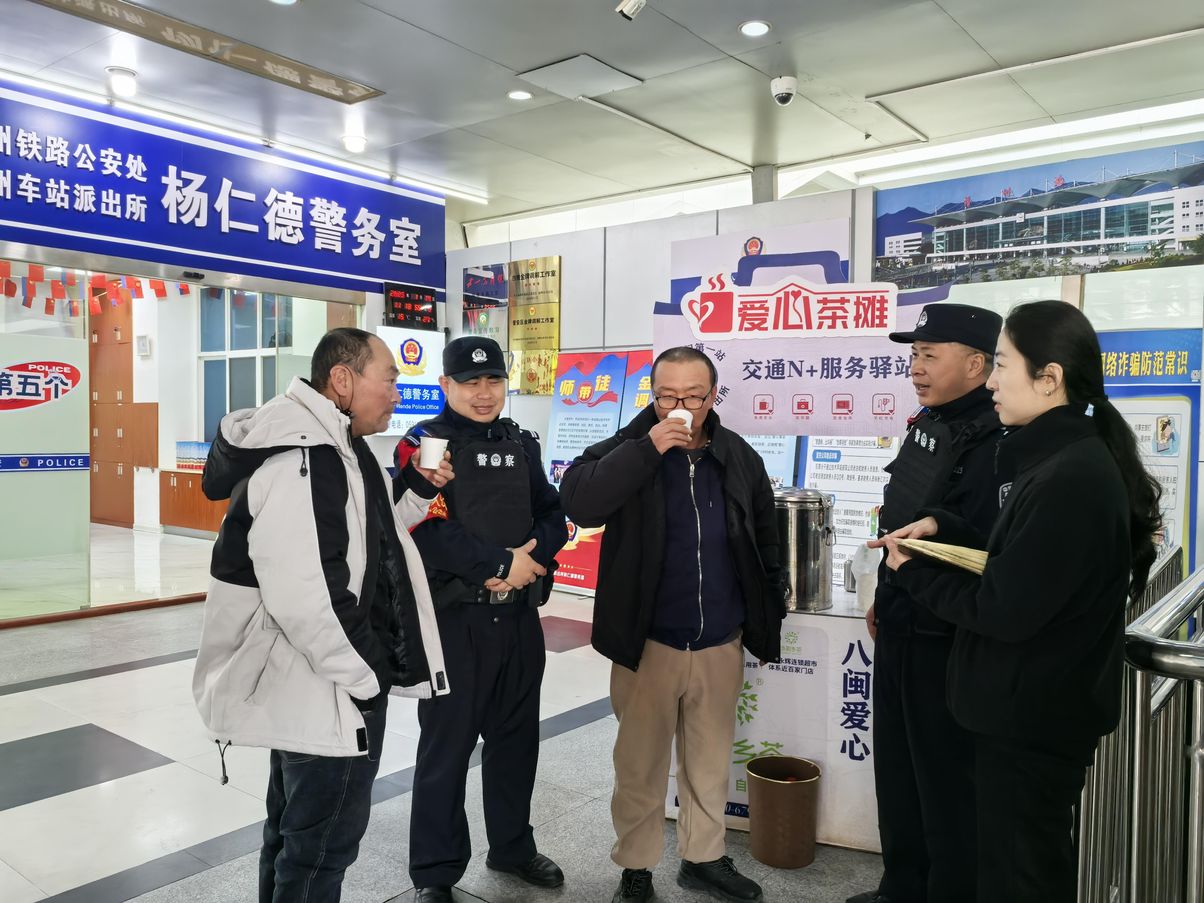 1月14日上午,在“楊仁德警務(wù)室”的“愛心茶攤”前,呂欽(左二)在師父楊仁德(右二)指導(dǎo)下高效解決了一起返鄉(xiāng)旅客求助。旅客們喝著熱茶,向記者(右一)稱贊福州鐵路公安的暖心服務(wù)。 本報(bào)通訊員 劉曉彬 攝