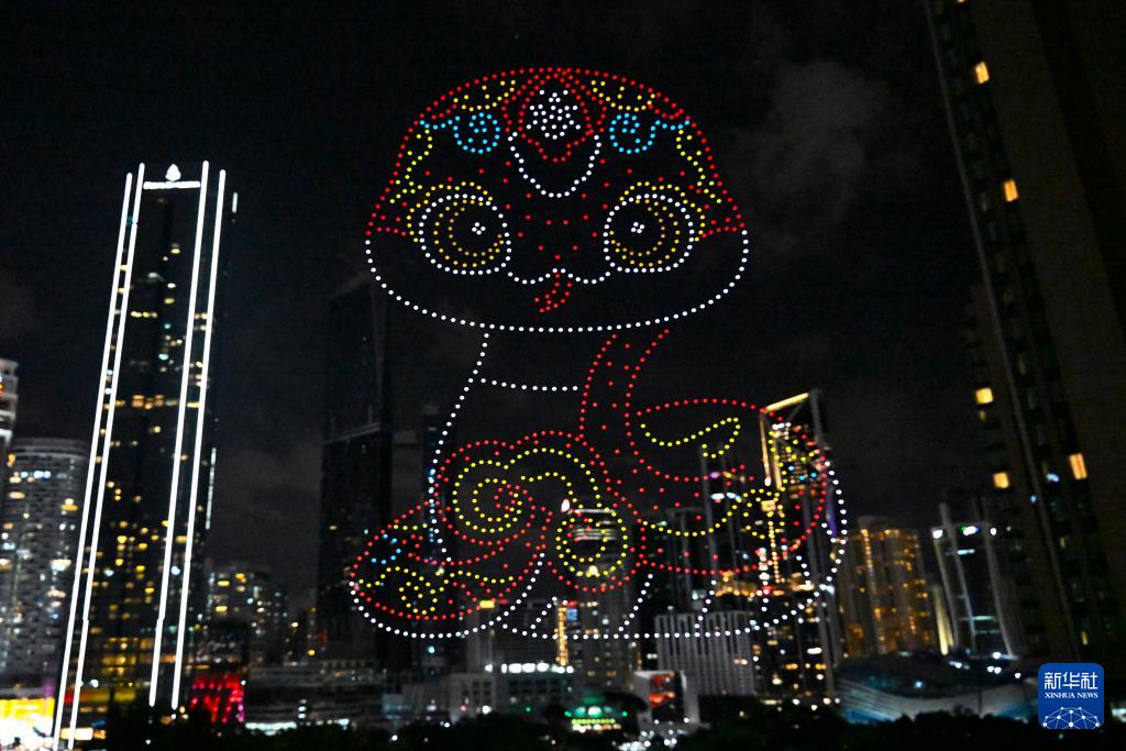 1月25日,在馬來西亞吉隆坡舉行的2025年“歡樂春節(jié)”全球啟動儀式前,無人機(jī)展示蛇年主題圖案。