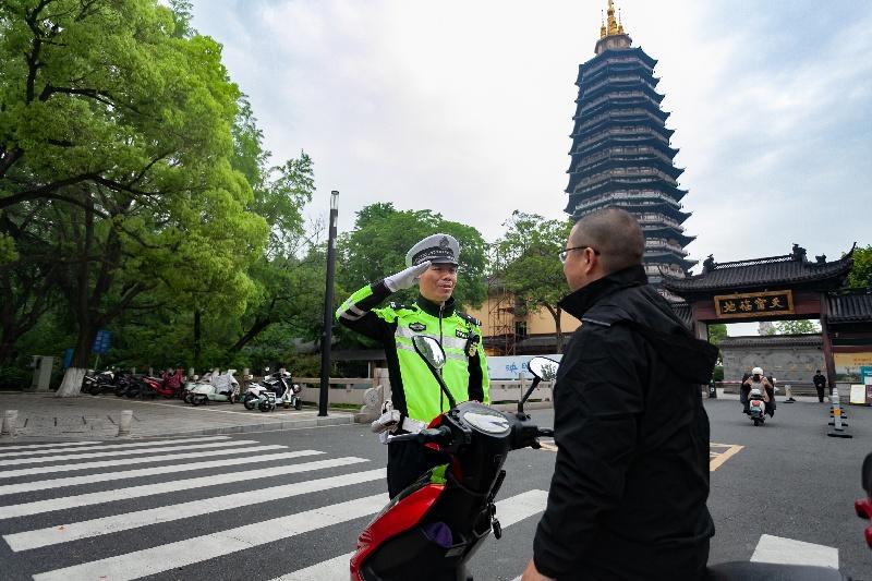雖然戴著手套,但握著車把的粗礪手掌還是凍出了些裂口,稍微扯一扯就生疼。這是任傳棟參加常州天寧寶塔聽(tīng)鐘聲迎新年安保任務(wù)的第十五個(gè)年頭,2009年工作后,每一個(gè)大年夜他都守在天寧寶塔邊的紅梅路上,15年來(lái)從不間斷。大年夜登天寧寶塔撞鐘祈福賞燈,已經(jīng)成了很多常州市民的“新年俗”,在紛至沓來(lái)卻秩序井然的車流人海背后,是常州交警數(shù)十年如一日?qǐng)?jiān)守崗位的守護(hù)。
