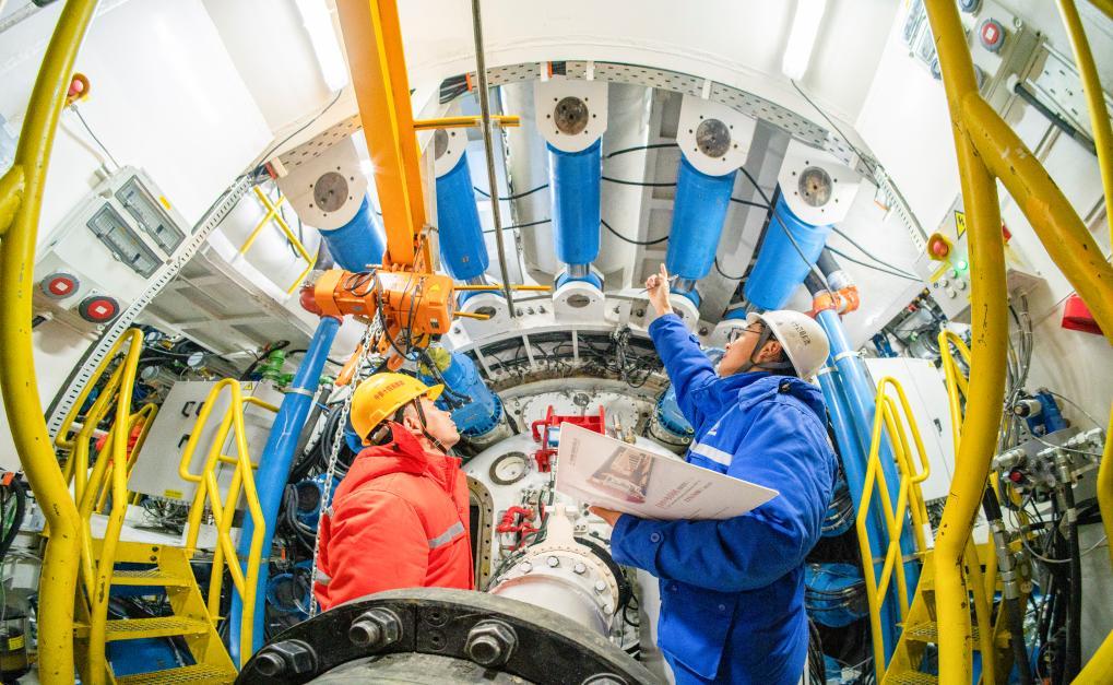圖為盾構(gòu)機(jī)維保人員在檢查盾構(gòu)機(jī)液壓系統(tǒng)。(中鐵十四局供圖)