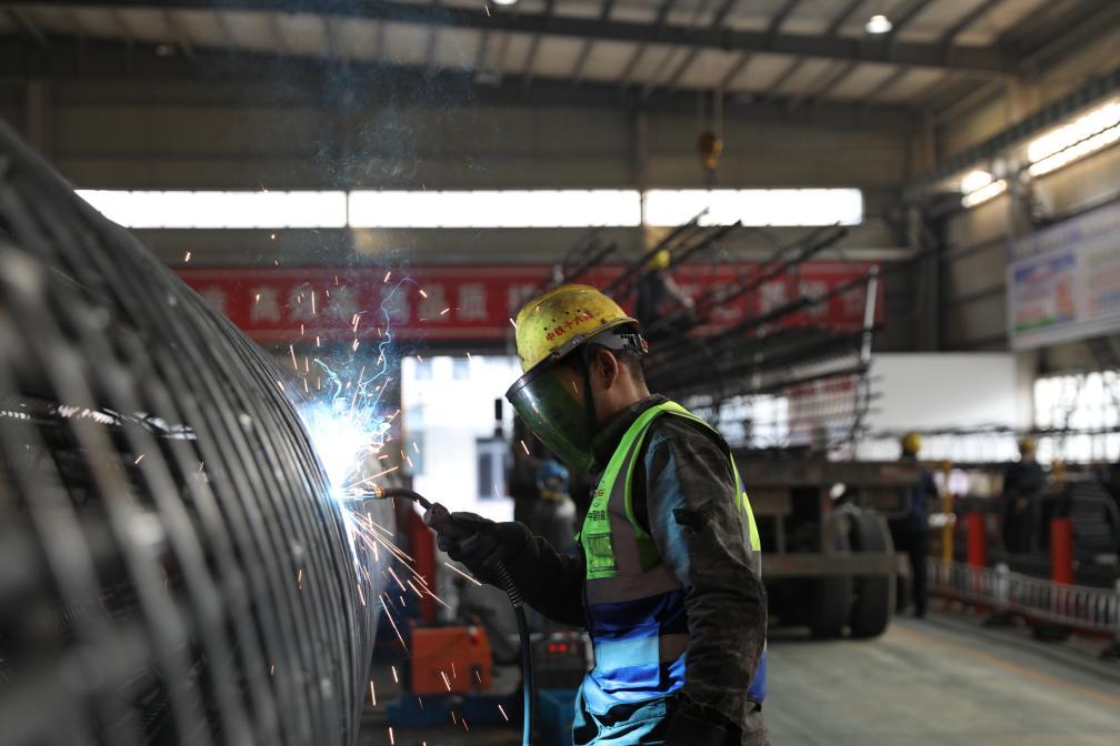 圖為通蘇嘉甬高鐵項(xiàng)目施工人員進(jìn)行鋼筋籠焊接。(中鐵十六局供圖)