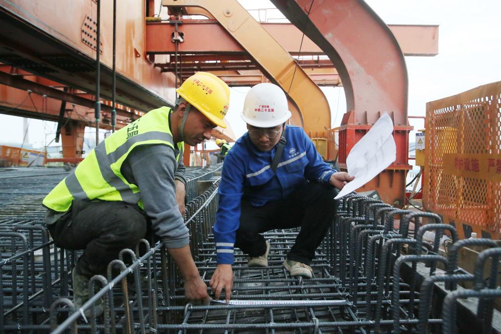 圖為吳基堅(jiān)(右)核對(duì)鋼筋綁扎參數(shù)。(中鐵二十五局供圖)
