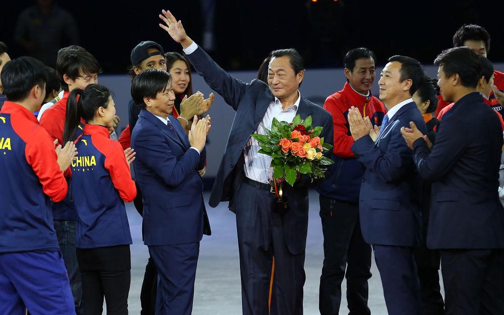 資料圖:中國花樣滑冰隊總教練姚濱(中)在頒獎儀式上向觀眾揮手致意。當(dāng)日,2015奧迪中國杯花滑大獎賽在北京首都體育館落幕。在比賽后,姚濱獲頒終身成就獎。新華社記者 曹燦 攝