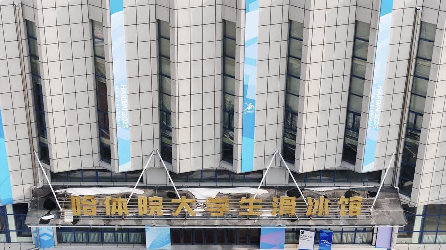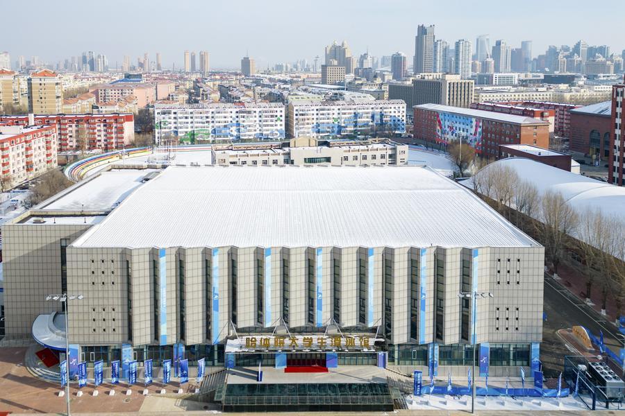 這是1月27日拍攝的哈爾濱體育學(xué)院大學(xué)生滑冰館(女子冰球比賽場(chǎng)館)(無(wú)人機(jī)照片)。新華社記者 張濤 攝