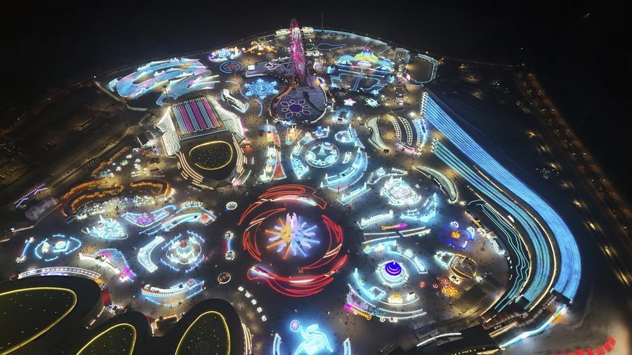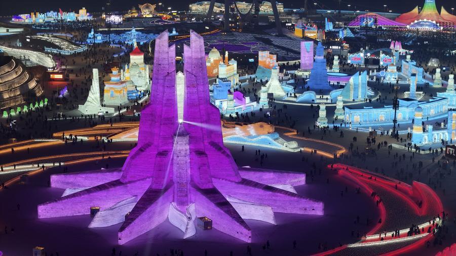 這是1月26日拍攝的第二十六屆哈爾濱冰雪大世界園區(qū),這里將作為亞冬會(huì)開(kāi)幕式的分會(huì)場(chǎng)(無(wú)人機(jī)照片)。新華社記者 王松 攝
