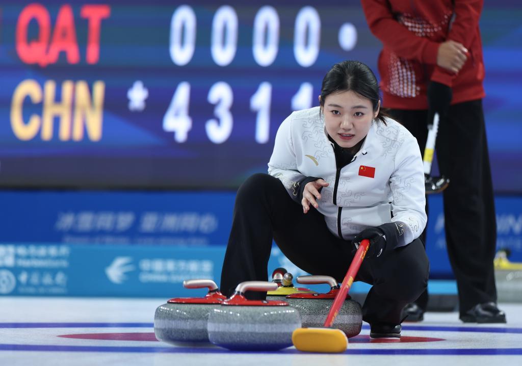 2月6日,中國(guó)隊(duì)選手韓雨在比賽中。當(dāng)日,在哈爾濱舉行的第九屆亞冬會(huì)冰壺混雙循環(huán)賽B組第8輪比賽中,中國(guó)隊(duì)10比1戰(zhàn)勝卡塔爾隊(duì)。新華社記者 王楷焱 攝