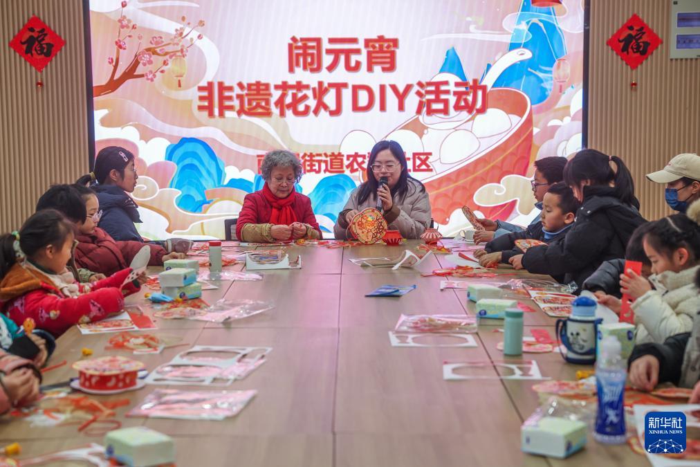 2月6日,嘉興市南湖區(qū)南湖街道農(nóng)翔社區(qū)的志愿者帶領(lǐng)居民一起做元宵花燈。