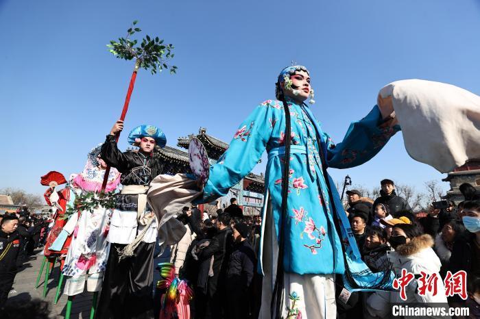 圖為2月9日,霸州市勝芳古鎮(zhèn)花會(huì)活動(dòng)現(xiàn)場,同義高蹺老會(huì)帶來精彩表演。賈珺 攝