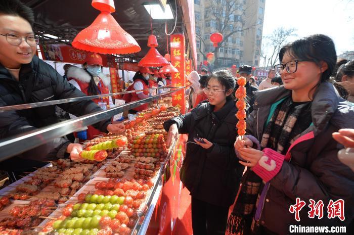 2月9日,民眾購(gòu)買糖球。當(dāng)日,位于青島市市北區(qū)的2025年青島蘿卜·元宵·糖球會(huì)海云庵會(huì)場(chǎng)開(kāi)街,豐富多彩的迎接元宵節(jié)活動(dòng)吸引大量民眾參與。蘿卜·元宵·糖球會(huì)擁有百年歷史,是當(dāng)?shù)刂匾拿袼谆顒?dòng)之一。王海濱 攝