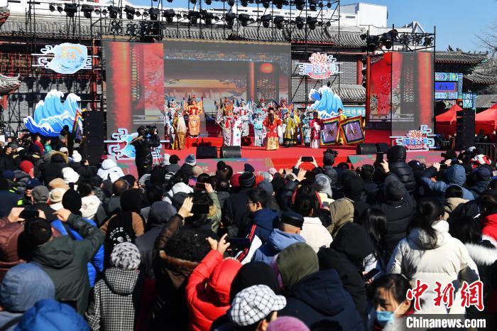2月9日,京劇表演吸引民眾欣賞。當(dāng)日,位于青島市市北區(qū)的2025年青島蘿卜·元宵·糖球會(huì)海云庵會(huì)場(chǎng)開(kāi)街,豐富多彩的迎接元宵節(jié)活動(dòng)吸引大量民眾參與。蘿卜·元宵·糖球會(huì)擁有百年歷史,是當(dāng)?shù)刂匾拿袼谆顒?dòng)之一。王海濱 攝