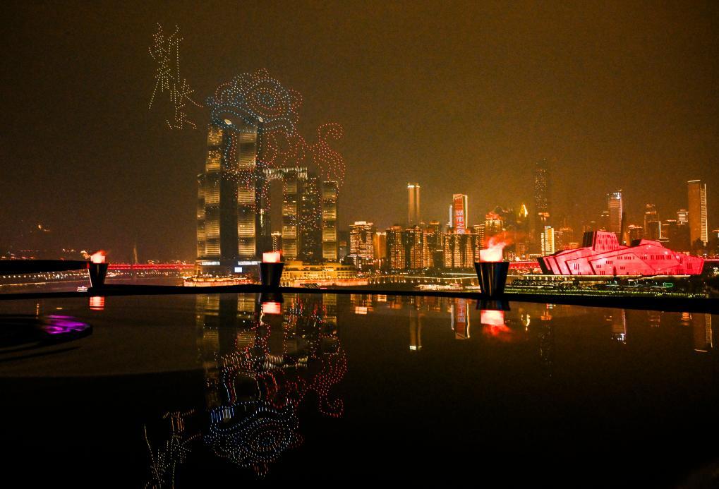 圖為在重慶拍攝的無(wú)人機(jī)表演。春節(jié)期間,多場(chǎng)無(wú)人機(jī)表演在重慶朝天門長(zhǎng)江、嘉陵江兩江交匯處精彩上演。新華社記者 王全超 攝
