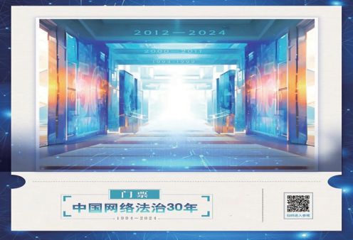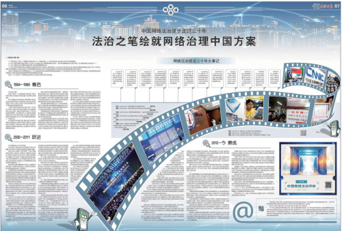 協(xié)調(diào)重要報道力量,采寫《中國網(wǎng)絡法治健步走過三十年法治之筆繪就網(wǎng)絡治理中國方案》報紙專版稿件,采用通版對開形式呈現(xiàn)。綜述文章雋永厚重,版面視覺效果恢弘大氣,圖文并茂地對《中國網(wǎng)絡法治三十年》報告進行了全面解讀,獲得全網(wǎng)廣泛傳播。在該專版中,既集納傳統(tǒng)的報紙通訊、記者手記等文字報道,又運用多種媒體元素、創(chuàng)新設計報紙版式。橫跨全版的“時光膠卷”一氣呵成,讓網(wǎng)絡法治建設三十年大事記躍然紙上。同時,放置新媒體“門票”海報,讓讀者沉浸式體驗網(wǎng)絡法治建設的歷史成就。