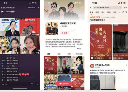 二是開展“我是憲法守護(hù)者”征稿傳播活動(dòng)。為助力憲法開放日傳播,抖音平臺(tái)邀請(qǐng)法律垂類TOP1的律師“大V”@李叔凡律師、優(yōu)秀醫(yī)生代表@郝鵬醫(yī)生參加最高法憲法開放日庭審現(xiàn)場(chǎng),宣傳最高法審判庭“定分重在止?fàn)帯钡脑瓌t,提升法院正面形象傳播,視頻累計(jì)播放量近百萬(wàn)。發(fā)酵熱點(diǎn)#揭秘最高法憲法開放日現(xiàn)場(chǎng)、#我是憲法守護(hù)者,播放量約2100萬(wàn)。