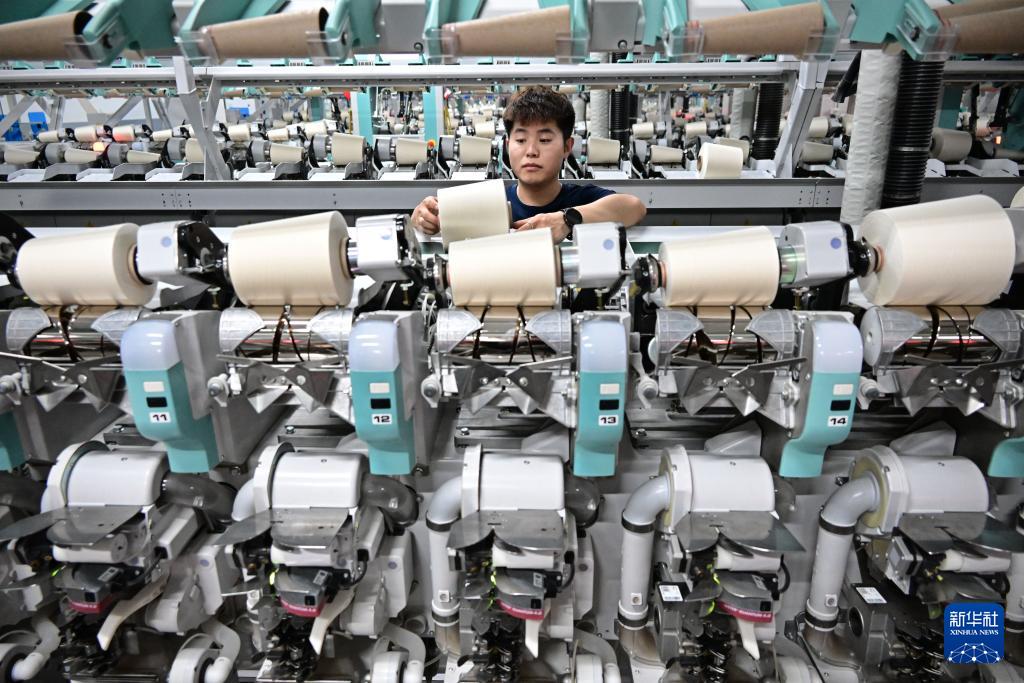 ??即墨區(qū)一家智慧紡紗企業(yè)的職工在全自動(dòng)絡(luò)筒生產(chǎn)線上抽檢高端纖維品質(zhì)(3月25日攝)。
