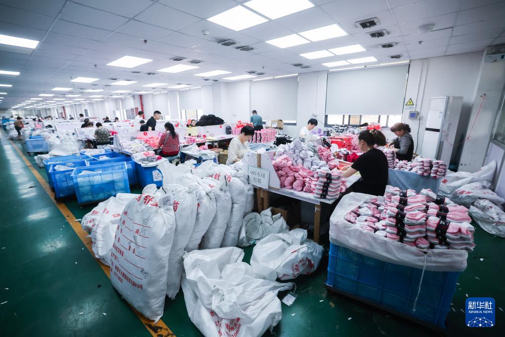 4月10日,在諸暨市緣錦針織有限公司的流水線上,工人在打包出口國(guó)外市場(chǎng)的襪子。