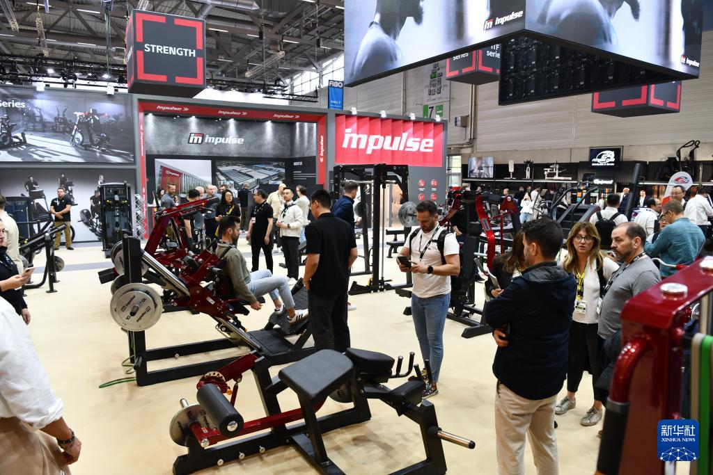 參觀者在2025年德國科隆健身健美及康體設(shè)施博覽會英派斯展位上體驗(4月10日攝)。