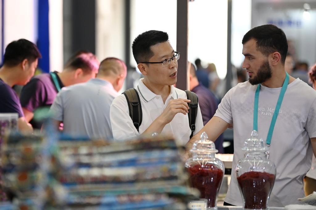 5月21日,在第九屆絲綢之路國際博覽會(huì)暨中國東西部合作與投資貿(mào)易洽談會(huì)絲路優(yōu)品展上,參觀者與參展商交流。新華社記者 李一博 攝