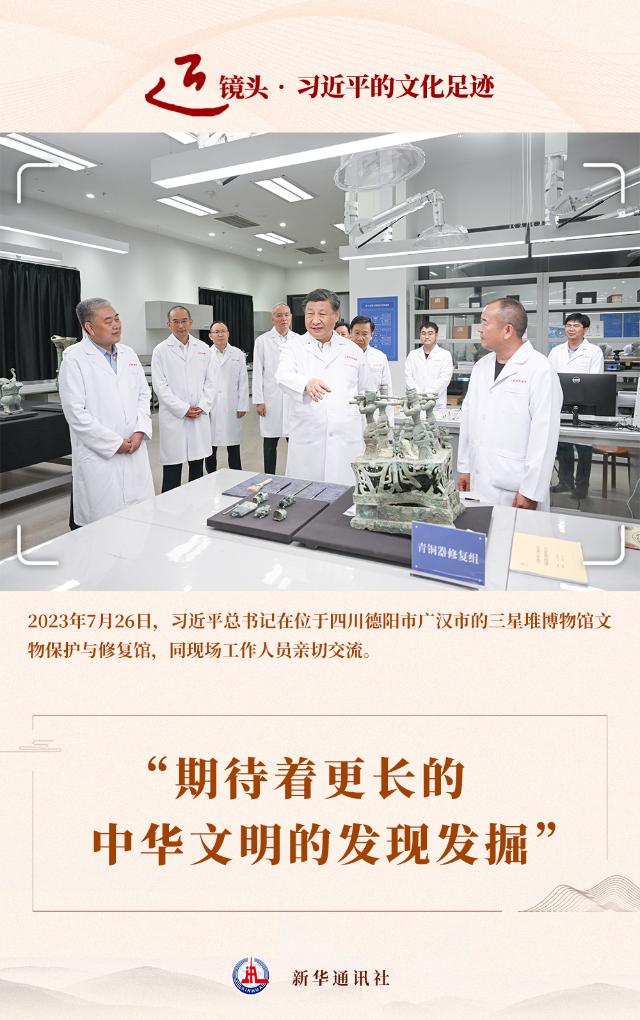 2023年7月26日,習(xí)近平總書記來(lái)到這里考察,對(duì)三星堆博物館新館的落成使用表示熱烈祝賀。
