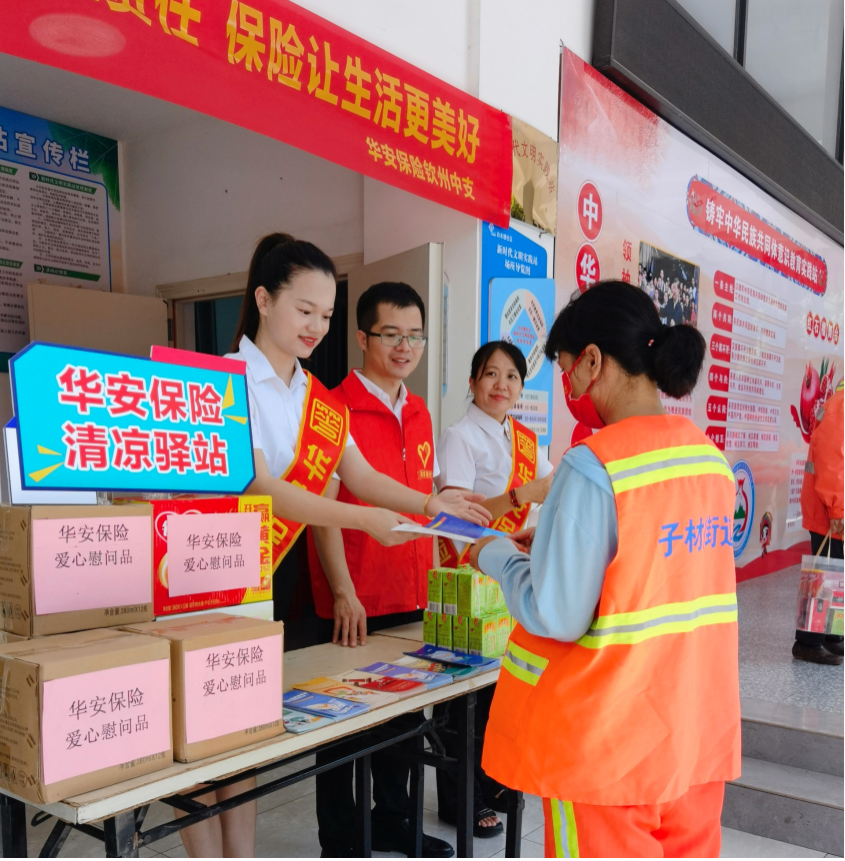 在廣西欽州白水塘社區(qū),華安保險的工作人員在開展“清涼驛站”活動慰問環(huán)衛(wèi)工人的同時,也向往來群眾開展防范非法金融活動宣傳;界首支公司在職場外設(shè)置了“清涼驛站”,連續(xù)多日為環(huán)衛(wèi)工人送上飲品、藥品和毛巾等防暑降溫物資;在湖北襄陽,工作人員前往襄州區(qū)西灣社區(qū)紅色驛站,把“清涼驛站”設(shè)在“紅色驛站”旁,一邊帶領(lǐng)員工開展紅色教育,一邊走進社區(qū)開展保險宣傳,將紅色文化與保險互助理念相融合;在云南曲靖,華安保險的員工參觀紅軍博物館重溫入黨誓詞,并在三百戶營村廣場組織員工和村民開展長征精神與保險知識有獎問答活動;在合肥蜀山區(qū)大溪地商業(yè)廣場,華安保險以“納涼+公益咨詢”的創(chuàng)新形式開展宣傳,為往來客戶送去納涼神器同時,也把更多金融提醒向公眾進行宣傳;7月7日下午,華安保險湖南分公司在長沙東方悅鄰商業(yè)廣場設(shè)立宣傳展臺,工作人員開展夏季用電安全知識有獎測試,并向過往市民普及保險知識、反欺詐技巧,同時為外賣和快遞小哥贈送消暑飲用水。