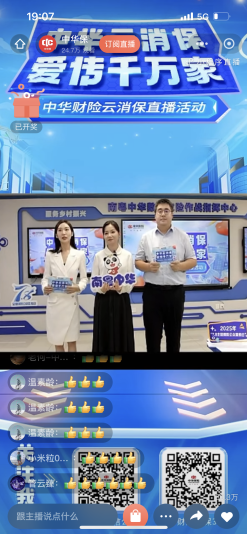 中華財(cái)險(xiǎn)廣東分公司結(jié)合“7.8 全國保險(xiǎn)公眾宣傳日”,創(chuàng)新開展消保主題直播,講解消費(fèi)者權(quán)益保護(hù)知識,圍繞理賠、投訴處理等熱點(diǎn)問題答疑解惑,累計(jì)吸引超萬人次觀看。分公司下轄機(jī)構(gòu)同步進(jìn)行轉(zhuǎn)發(fā)和推廣,擴(kuò)大宣傳覆蓋面,提升公眾維權(quán)意識。