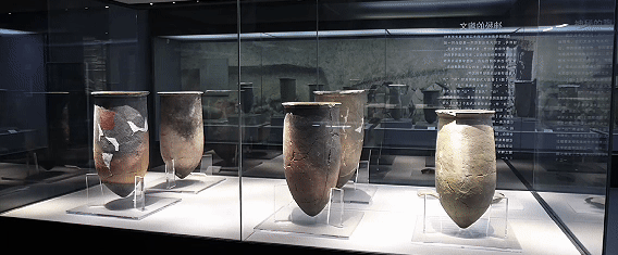 “這是一件出土于安徽蒙城新石器時代尉遲寺遺址的大口陶尊,距今大約4800年。”講解員指著一件陶器展品,“它的特別之處是器物上有著刻畫符號,分別是‘日’‘月’‘山’形。抽象的表達和組合,已經超越了簡單的圖畫,使我們看到了漢字的雛形?!?/p>