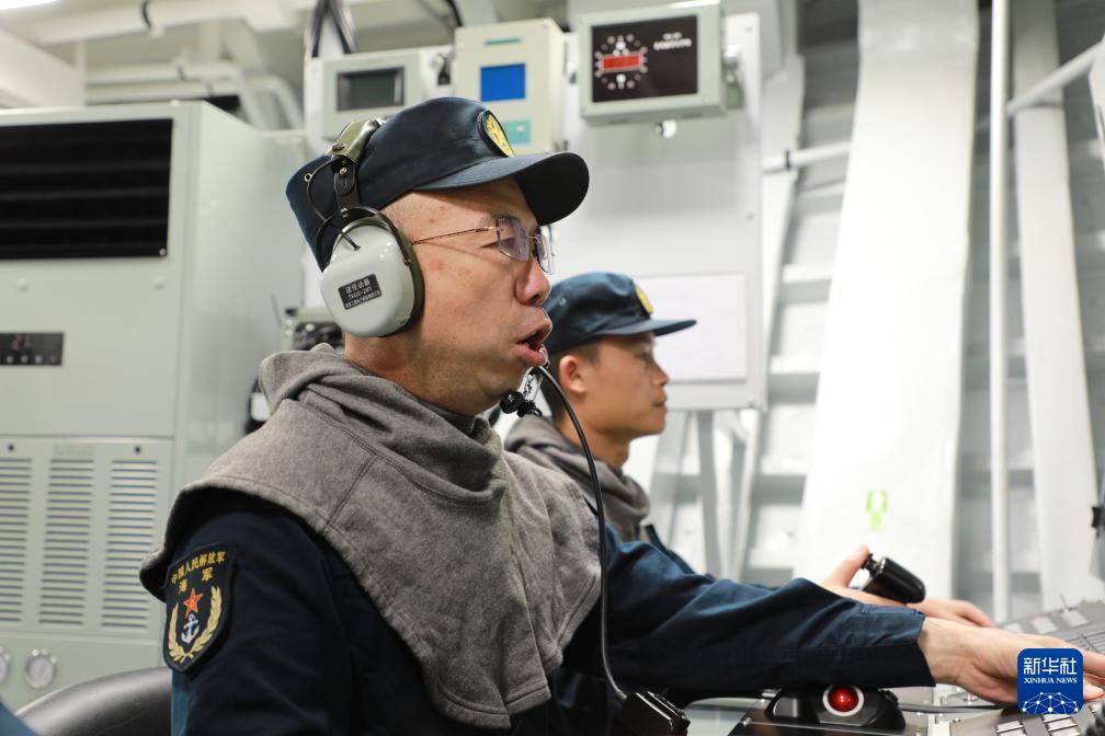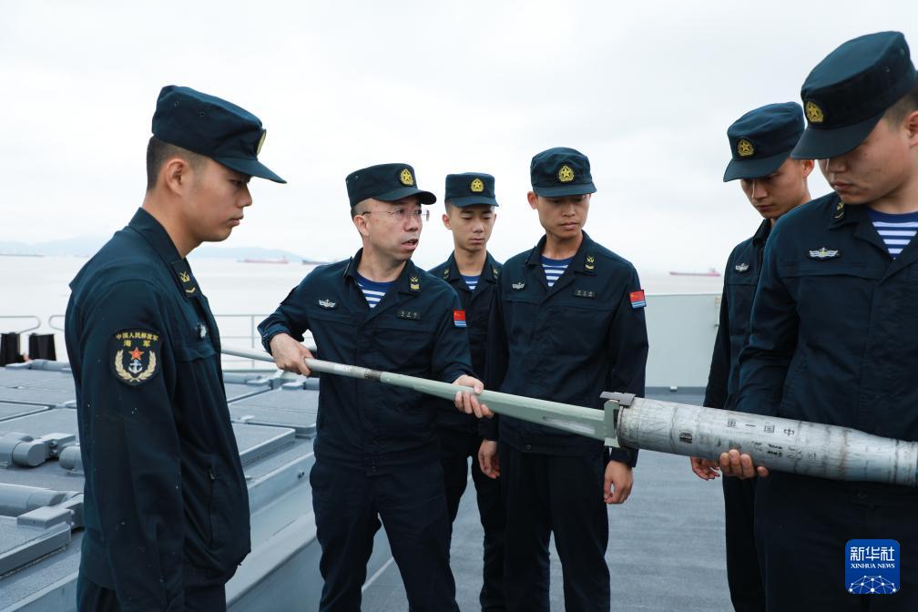 海軍資陽艦主炮區(qū)隊(duì)長馬少利(中)帶領(lǐng)戰(zhàn)友進(jìn)行裝備檢視(6月11日攝)。新華社記者 李秉宣 攝