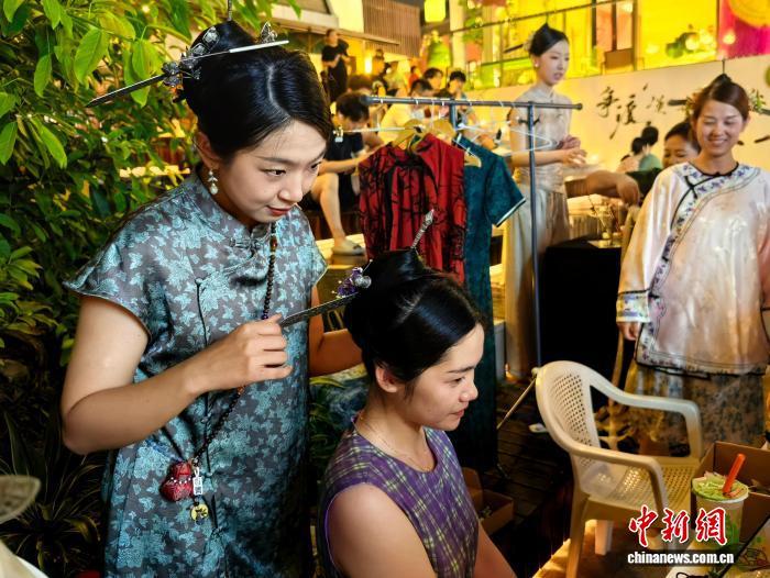 8月23日晚,在福州煙臺(tái)山歷史風(fēng)貌區(qū)的三條簪體驗(yàn)現(xiàn)場(chǎng),工作人員正在給一位女孩邊梳妝邊講解頭飾背后的文化寓意。 中新網(wǎng)記者 閆旭 攝