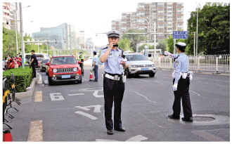 圖① 北京市交警在考點門口引導送考車輛駛入專用通道。