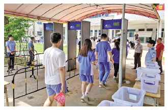 圖③ 在廣東省梅州市高級中學考點,考生們在民警引導下,有序通過智能安檢門進入考場。