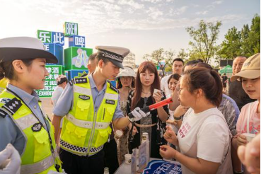 近日,陜西省西安市公安局交警支隊(duì)新城大隊(duì)聯(lián)合西安市商務(wù)局開展“生命無價(jià) 酒后禁駕”交通安全主題宣傳。圖為民警通過演示酒精檢測儀宣傳交通安全知識(shí)。
