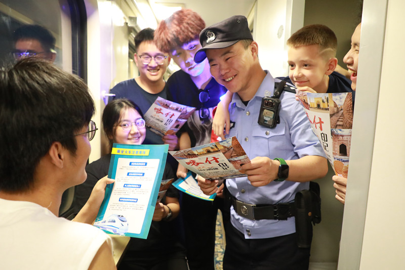 隨著暑期“新疆游”持續(xù)升溫,烏魯木齊鐵路公安局庫(kù)爾勒公安處乘警支隊(duì)以夏季治安打擊整治行動(dòng)為契機(jī),開(kāi)展打造平安列車(chē)專項(xiàng)行動(dòng),全力確保旅客平安出行。圖為7月30日,乘警在旅游專列上向游客宣講乘車(chē)安全常識(shí)并介紹新疆旅游資源及風(fēng)土人情。