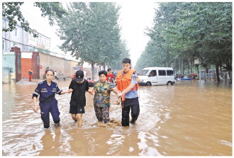 圖為河北省涿州市公安局雙塔派出所民警正在轉(zhuǎn)移受災(zāi)群眾。 本報通訊員 于波 攝