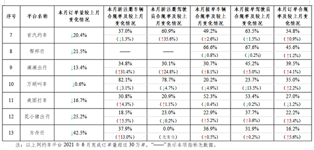 一、在訂單量超過(guò)30萬(wàn)單的網(wǎng)約車平臺(tái)中,訂單合規(guī)率最高的是如祺出行,最低的是方舟行。2021年6月訂單量超過(guò)30萬(wàn)單的網(wǎng)約車平臺(tái)共13家。與5月份相比,招招出行、東風(fēng)出行從5月訂單量超過(guò)30萬(wàn)單降到30萬(wàn)單以下。按訂單合規(guī)率(指駕駛員和車輛均獲得許可的訂單量占比)從高到低的分別是如祺出行、享道出行、T3出行、神州專車、陽(yáng)光出行、曹操出行、首汽約車、幫邦行、滴滴出行、萬(wàn)順叫車、美團(tuán)打車、花小豬出行、方舟行。本月訂單合規(guī)率增長(zhǎng)排名前3名的分別是如祺出行、方舟行、花小豬出行;下降最多的分別是曹操出行、享道出行、美團(tuán)打車。