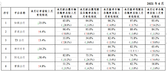 一、在訂單量超過30萬單的網(wǎng)約車平臺中,訂單合規(guī)率最高的是如祺出行,最低的是方舟行。2021年6月訂單量超過30萬單的網(wǎng)約車平臺共13家。與5月份相比,招招出行、東風(fēng)出行從5月訂單量超過30萬單降到30萬單以下。按訂單合規(guī)率(指駕駛員和車輛均獲得許可的訂單量占比)從高到低的分別是如祺出行、享道出行、T3出行、神州專車、陽光出行、曹操出行、首汽約車、幫邦行、滴滴出行、萬順叫車、美團打車、花小豬出行、方舟行。本月訂單合規(guī)率增長排名前3名的分別是如祺出行、方舟行、花小豬出行;下降最多的分別是曹操出行、享道出行、美團打車。