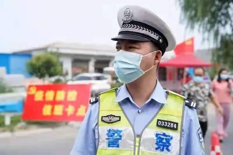 這已經(jīng)是他連續(xù)奮戰(zhàn)在疫情防控卡點的第七天,三伏烈日,汗流浹背,警服濕了干,干了又濕,口罩的形狀烙在了黝黑的臉龐,沙啞的嗓子,不停地往嘴里放潤喉片。