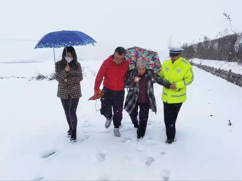 圖為濟(jì)南市公安局交警支隊(duì)長(zhǎng)清大隊(duì)歸德中隊(duì)民警將遇困車(chē)輛上的老人攙扶到中隊(duì)。