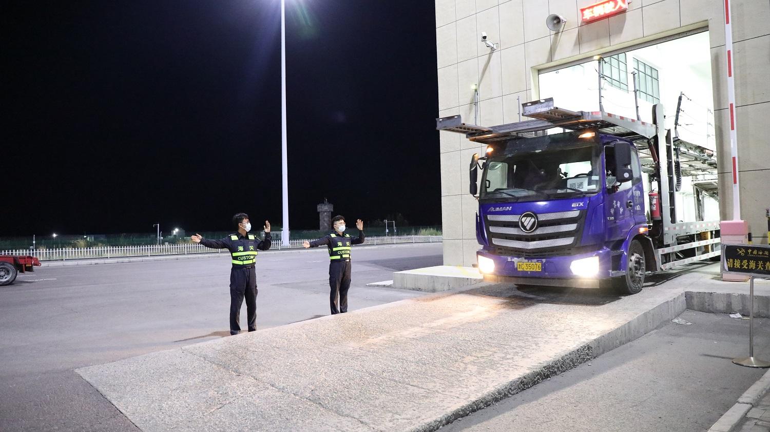 通過智能卡口系統(tǒng),出境貨車刷卡后,海關(guān)即可獲知查驗處置或已放行等信息指示,車輛從停穩(wěn)、刷卡到獲取提示,整個過程不到30秒。