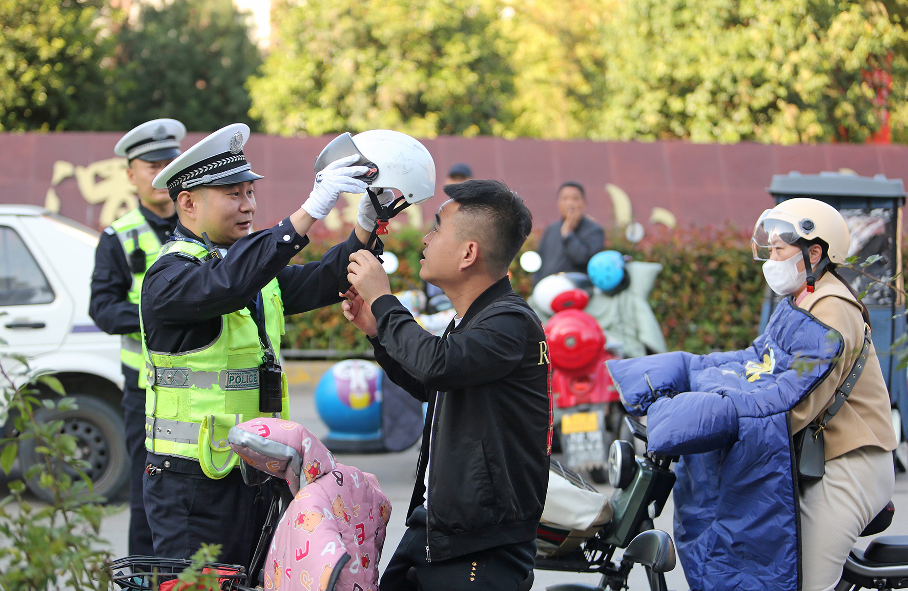 10月20日,陜西省渭南市區(qū)樂天大街中段,民警提醒市民佩戴好安全頭盔。連日來,陜西省渭南市公安局交警支隊組織中心城區(qū)開展“一盔一帶”專項整治行動。民警采取“勸導+教育”的方式,對駕乘電動自行車未佩戴安全頭盔群眾進行查糾、勸導,不斷提升市民安全出行意識。