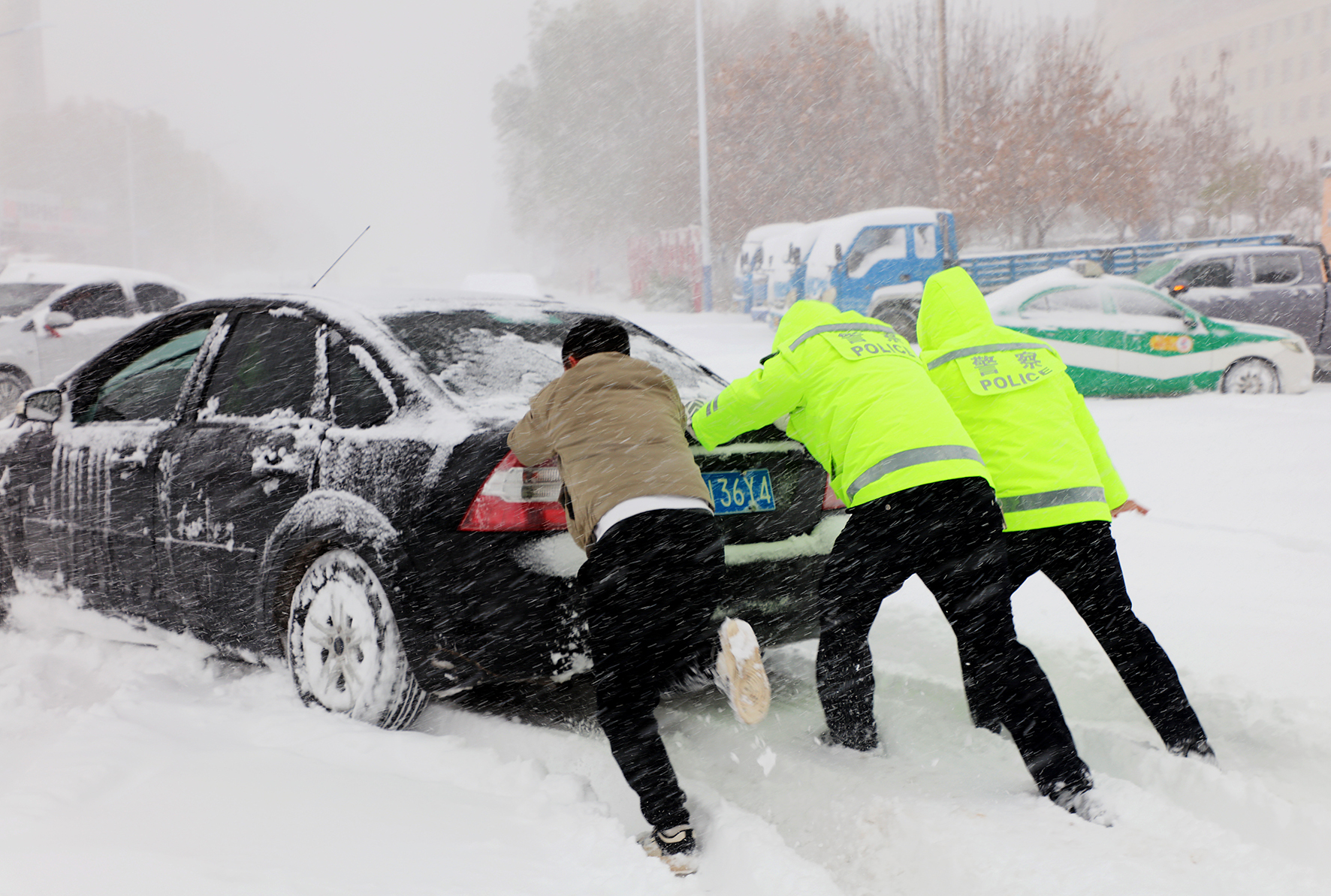 11月6日,遼寧省阜新市公安局交警支隊(duì)啟動(dòng)惡劣天氣預(yù)案,全體民輔警迅速上崗,疏導(dǎo)交通,救援車輛。