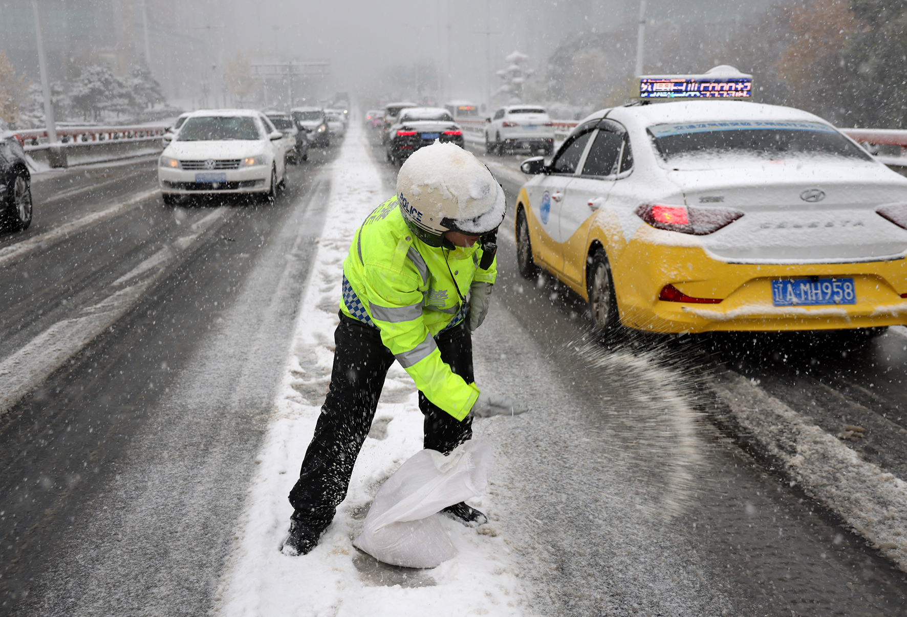 11月6日,遼寧省沈陽市公安局交通警察局以雪為令,對(duì)車流行人和坡面路段重點(diǎn)布置警力,確保市民出行安全暢通。