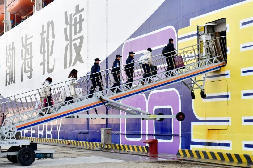 1月21日,在山東港口煙臺(tái)港客運(yùn)站,煙臺(tái)市港航公安局乘務(wù)警察支隊(duì)的乘警一組三人登乘渤海輪渡“中華復(fù)興”輪執(zhí)勤。郭緒雷/攝