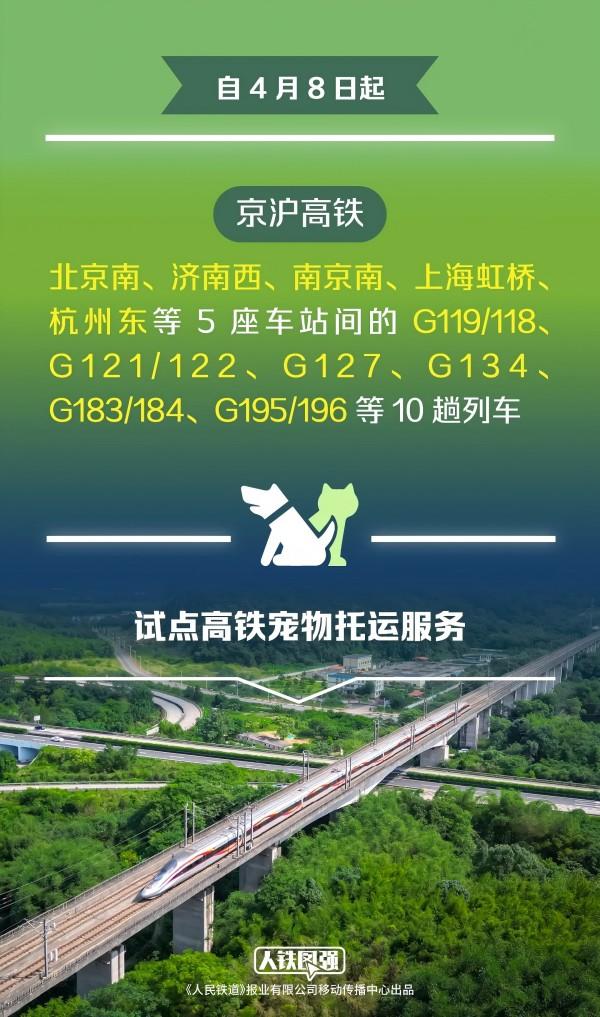 鐵路部門(mén)持續(xù)深化運(yùn)輸供給側(cè)結(jié)構(gòu)性改革,積極適應(yīng)廣大旅客多樣化的出行需求,在廣泛聽(tīng)取旅客意見(jiàn)、深入開(kāi)展市場(chǎng)調(diào)查基礎(chǔ)上,經(jīng)過(guò)專業(yè)測(cè)試評(píng)估,自4月8日起在京滬高鐵北京南、濟(jì)南西、南京南、上海虹橋、杭州東等5座車站間的G119/118、G121/122、G127、G134、G183/184、G195/196等10趟列車上試點(diǎn)高鐵寵物托運(yùn)服務(wù)。