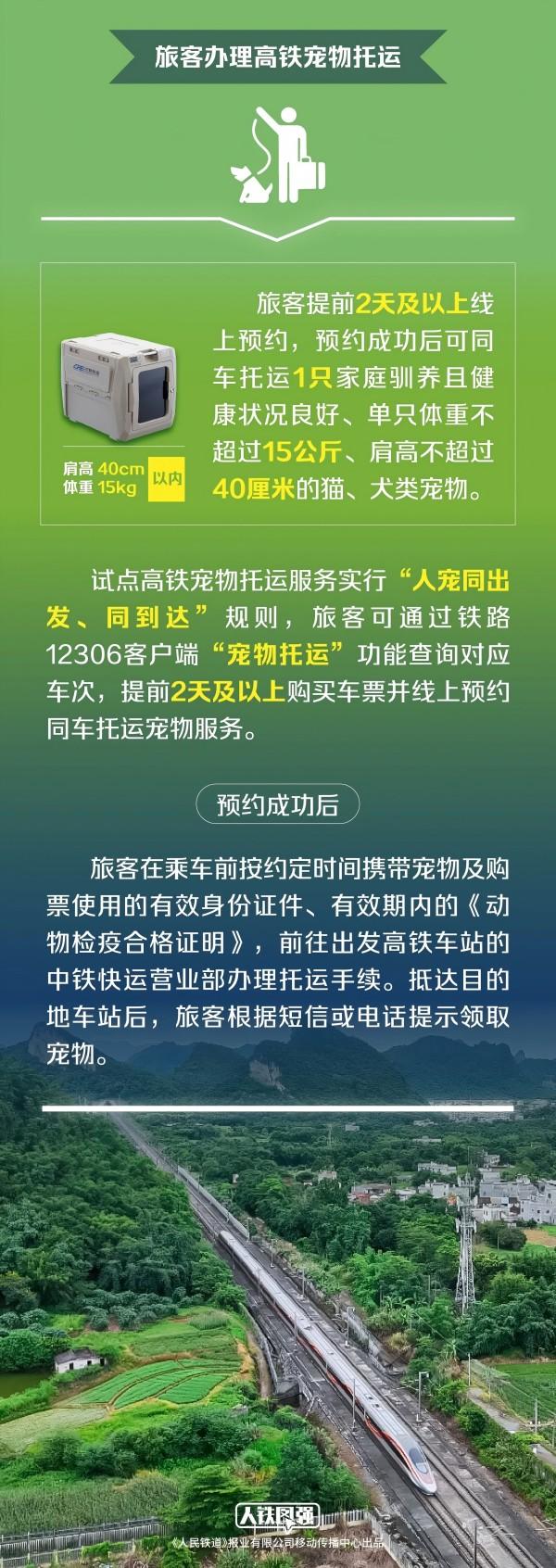 4月8日起,鐵路部門(mén)在京滬高鐵部分車次試點(diǎn)“隔離運(yùn)輸、人寵分開(kāi)、專人看護(hù)”的高鐵寵物托運(yùn)服務(wù),鐵路12306同步推出“寵物托運(yùn)”功能,旅客提前2天及以上線上預(yù)約,預(yù)約成功后可同車托運(yùn)1只家庭馴養(yǎng)且健康狀況良好、單只體重不超過(guò)15公斤、肩高不超過(guò)40厘米的貓、犬類寵物。